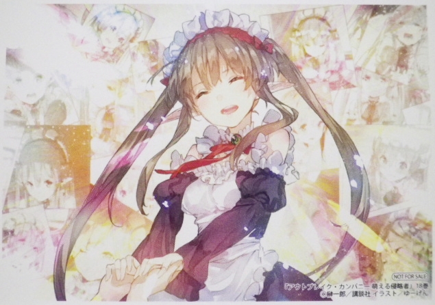 ゆーげん初、画集 榊一郎作品関連 2018年04月10日 『ゆーげん画集 アウトブレイク・カンパニー 萌える侵略者』イラスト:ゆーげん小説原作:榊 一郎『アウトブレイク・カンパニー 萌える侵略者』の秀麗イラスト、全てを収録!大団円を迎えた本作を彩った、イラストレーター・ゆーげん氏の初画集。タイトルの通り、収録されているのはすべて『OBC』のイラスト。 まずは表紙を飾ったもの。出番は本当に日本に里帰りした時だけだったが、主人公の妹の詩月、可愛いんだよなぁ……。サブキャラだけど、ドワーフ族の少女・ロロンも好き(画像左の左下)。 口絵とピンナップ。クラーラ(画像左)もサブキャラでは群を抜いて好きだった。この巻はまさにご褒美!そしてエルビアの巨乳!(画像右)不思議なもので、布面積が広い服を着てる方がエロいという……ミステリー。アニメのパッケージなど、文庫に直接の関りはないイラストも多数収録。左はTBSアニメフェスタのカタログ、右はラノベ文庫の年賀状。 デザイン画。クラーラ(左)とロロン(右)、奇しくも推しキャラが両方ロリ系……無表情でロリだと破壊力が増すんだよ!?ただ、2人ともゲストというかサブキャラなので、がっつり出番があるのは初登場の巻くらいなのが残念……。挿絵。サイズこそ文庫版より小さいが、こうしてまとめて見るとそのシーンが浮かんでくる。当然だが、18巻もあればエピソードもかなりある訳で……良い作品だったなぁ……。巻末には原作者と担当編集を交えた3人による鼎談(ていだん)が収録されており、かなり興味深い内容。仮にイラストに興味がなくとも、榊さんのファンなら読んでおいて損はないと思う。なお、一部の販売サイト(amazonなど)では“榊一郎書き下ろしスピンアウト小説収録”とあるが、これは諸事情で収録されていないので注意してほしい。あたしは榊さんのツイッターで知ったが、この情報がすべての販売サイトには伝わっていないらしい。原作共々、是非。