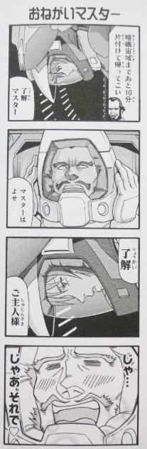 世界でたった一つのガンダムUCギャグ、見参!! ラノベ・漫画・雑誌・ムック 2016年07月04日 『機動戦士ガンダムUC4コマ ももいろNT‐D発動編』『機動戦士ガンダムUC4コマ 黒いライオン大暴走編』『機動戦士ガンダムUC4コマ 赤いアイツとドッキング編』著者:谷 和也ミネバがバナージが、フロンタルが……!アニメもついに完結の『機動戦士ガンダムUC』を、容赦なく笑いの渦に巻き込んだ傑作ギャグが大集結。ワンアンドオンリーの抱腹絶倒4コマ、これを読めるのは大人の特権だ!買ったものの気付けば2年寝かせていたので、TV版が放送されている今こそ読むべきだと思い、一気に読了。やはり面白い。この手のパロディは『ガンダム』シリーズ全般に精通していないと笑えなかったりするディープなものも多いが、この作品は比較的ライトなファンでも十分に楽しめると思う(無論、ディープなファンも)。ちなみに、基本的にはこういうノリ。単純にギャグとしてのクオリティも高いと思うが、所々に出てくるモブの女の子が妙に可愛いのもポイント。 他にも、ラー・カイラムのセンサー担当(CV:藩めぐみ)をピックアップしたり。バナージの女装が妙に可愛かったり。マリーダをツインテールにしたりツンデレにしたり。 良い意味でファン目線というか、純粋に共感出来る。メイドやネコミミのネタも多いし。前作『ハイブリッド4コマ大戦線』シリーズ共々オススメ。