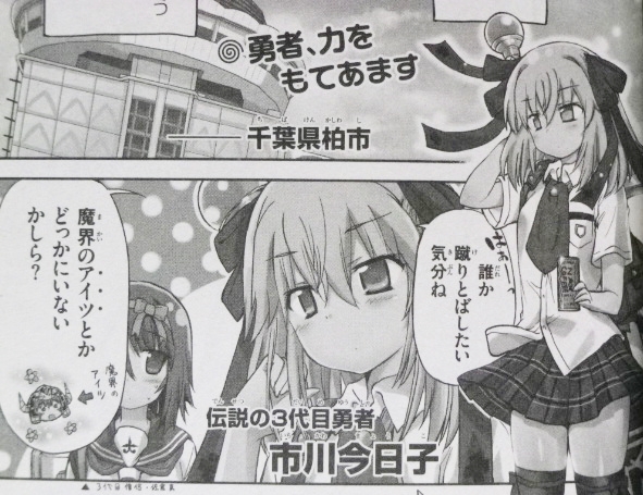 変わりゆく街並み 変わらない魔王と JK勇者の力関係(パワーバランス) ラノベ・漫画・雑誌・ムック 2017年05月08日 『あしたの今日子さん』第6巻著者:いわさき まさかず3代目勇者のキョコタンは今日もここ地元・千葉県柏の町で、ダラダラと放課後勇者タイムを満喫中!ところが、世界征服を目論む魔王に彼女の弱点を知られてしまう。無敵のJK勇者がついに追いつめられる!!!今回も表紙のキョコタンはメチャクチャ可愛い!完全に詐欺だよね!だって、実態はこれだぜ!?いや、このギャップが魅力だけども!そんなキョコタンは犬が苦手と知り、魔王は部下達をコスプレさせる作戦に。マーリンとガウ(パーシヴァルは扱いが小さい……)、超可愛い!ガウとパーの、こんな微笑ましいエピソードも!キマシ!そして、第6巻のイチオシのエピソードはこちら。パーシヴァルのパンツを見てしまった魔王が、女性陣から総スカンを食らう!しかし、パーシヴァルも可愛い!内向的な性格なんだけど、ファッションはパンクで、何気にエロく……しかもネコミミだぜ!?最高かよ!?個人的にはガウもツンデレ風味で可愛く、マーリンさんも色気は微妙だけど巨乳だし健気でたまらん。勇者一行も可愛いけど、魔王サイドも可愛い娘いっぱい!オススメ!