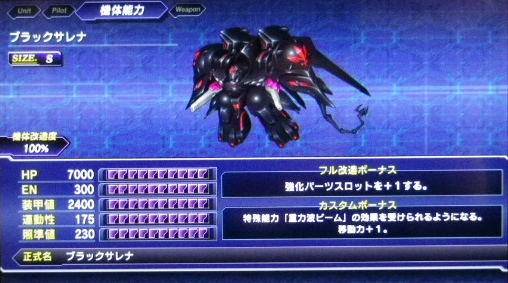 流遠亜沙 ASSAULT form 「しかも、アキトのエースボーナスが、敵のターンに攻撃力と回避率がアップだから、フル改造してフルカウンター付けて敵に突っ込ませると、次のターンでえらい事になる。爽快! 〈ブラックサレナ〉は5段階改造で重力波ビームを受けられるようになるから、〈ナデシコ〉と一緒に出撃させれば、もう無敵ですよ! 性能も戦闘アニメも最高だし、感無量!」