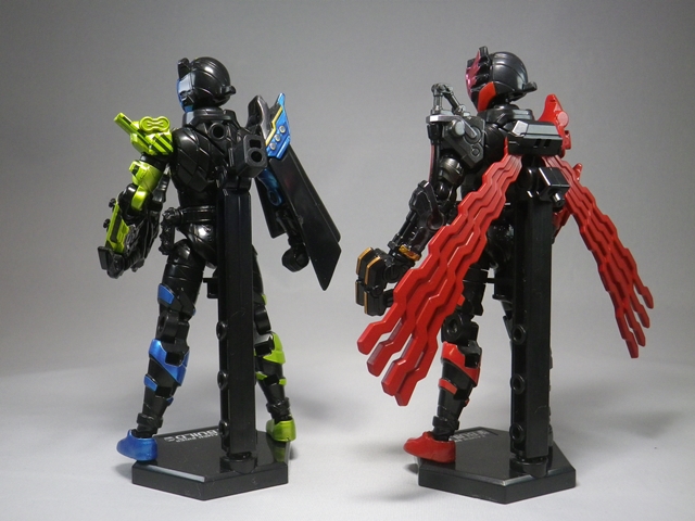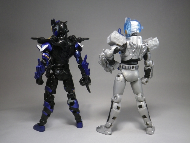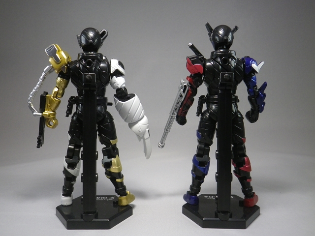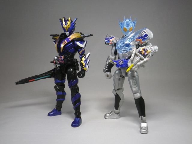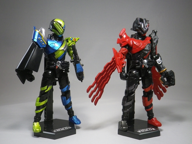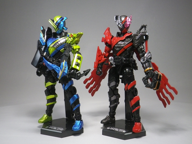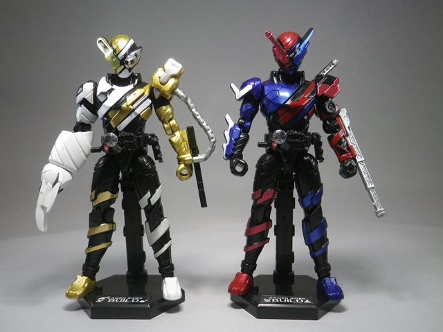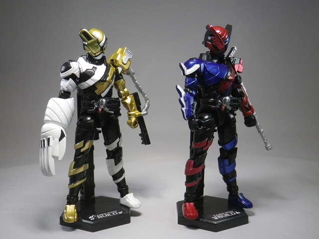創動 仮面ライダービルド BUILD1~5 模型・玩具・食玩・フィギュア 2018年03月07日 流遠亜沙 ASSAULT form「本日は、前回のブログで紹介した商品のひとつ、『創動 仮面ライダービルド』シリーズのご紹介です」ヤミヒメ「すでに買ってあるという事だったな」流遠亜沙 ASSAULT form「うい。しかも、あの時点で撮影まで済んでおります」ツバキ ASSAULT form「他にも記事にしてないネタが溜まってるんですよね」流遠亜沙 ASSAULT form「画像を撮って記事にするとなると、意外と時間がかかっちゃうのよね。今回はサクサク行くわよ」 仮面ライダービルド ラビットタンクフォームヤミヒメ「基本フォームとも言うべき姿だな」ツバキ ASSAULT form「9月に発売されたものが、よく売ってましたね」流遠亜沙 ASSAULT form「あちこちコンビニやらスーパーを回ったら、『タンクハーフボディ』を見つけちゃって。『ラビットハーフボディ』はamazonで買いました――1680円で」ヤミヒメ「定価は400円ほどなのであろう?」ツバキ ASSAULT form「すでに、ほぼ市場に出回っていない商品ですし、食玩の単品販売は値が張るんですよね」流遠亜沙 ASSAULT form「せやねん。でもまあ、『ラビット』だけでも定価で買えた事を思えば、まだマシかなと。基本フォームは並べる上で外せないし。ちなみに、この『ラビット』と『タンク』のみ、無可動の『ダミーボディ』が付属します」 ダミーボディヤミヒメ「ダミー同士でも合体するのか」ツバキ ASSAULT form「後ろから見るとスカスカですね」 海賊レッシャーフォーム(左)/フェニックスロボフォーム(右)流遠亜沙 ASSAULT form「続いてはビルドのベストマッチ、『BUILD4』の海賊レッシャーフォームと、『BUILD5』のフェニックスロボフォームです」ツバキ ASSAULT form「フェニックスロボは冬の劇場版に登場しましたね」ヤミヒメ「うむ。赤と黒の組み合わせが良いな」流遠亜沙 ASSAULT form「あの時は羽根が印象的だったんだけど、こうして見ると『ロボ』のアームも素敵。『フェニックス』と『ロボ』っていう組み合わせの妙も良い」 パンダロックフォーム(左)/ドラゴン消防車フォーム(右)ツバキ ASSAULT form「これはベストマッチではない組み合わせですね」流遠亜沙 ASSAULT form「劇中では出来ないオリジナルの組み合わせが出来るのが、この手の商品の楽しい要素よね。『パンダ』のみ『BUILD2』に収録で、残りは『BUILD3』のラインナップです」ヤミヒメ「本来は『ドラゴン』と『ロック』がベストマッチなのだな」流遠亜沙 ASSAULT form「『消防車』と『ドラゴン』をラビットタンクと逆の“青赤”にしたくて。で、近所のスーパーで『パンダ』が半額で売ってて、『ロック』と合いそうだったんでこの組み合わせになりました」 仮面ライダークローズ(左)/仮面ライダークローズチャージ(右)流遠亜沙 ASSAULT form「2号ライダーに当たる仮面ライダークローズと、放送中の現在の姿であるクローズチャージです。クローズはベストマッチする『ドラゴン』と同じく『BUILD3』に、クローズチャージは『BUILD5』に収録されております」ヤミヒメ「ん? という事は、『ドラゴン』は2つ買ったのか?」流遠亜沙 ASSAULT form「そうです。先にクローズを組んで、『消防車』と合いそうだったんで『ドラゴン』をもう1つ。半額だったので」ツバキ ASSAULT form「どういった経緯でベルトが変わったのか、前半を観ていないので気になりますね」 ナイトローグ流遠亜沙 ASSAULT form「最後はすでに劇中では退場したらしいナイトローグ。『BUILD2』に収録されてるんだけど、これは『BUILD5』に再録されたもので、バイザーに“目”がないシールが封入されております」ヤミヒメ「ふむ。ローグは仮面ライダーだが、ナイトローグはライダーではないらしいな」ツバキ ASSAULT form「スマッシュと呼ばれる怪人で、人間が変身していますね。『555(ファイズ)』のオルフェノクや、『W(ダブル)』のドーパントに近いのかもしれません」流遠亜沙 ASSAULT form「どちらにせよカッコイイ。これは実際に造形で見ると、よく判る」ツバキ ASSAULT form「ローグも同じですね。雑誌の写真で見た際は微妙な印象でしたが、劇中での活躍を見ると格好良くしか見えなくなります」ヤミヒメ「そこまで考えてデザインされているのであろう」流遠亜沙 ASSAULT form「とまあ、駆け足だけど『BUILD5』までで買ったものをご紹介いたしました。すでに最新の『BUILD6』が発売中なんだけど、この記事を書いてる時点で入手できてません」ヤミヒメ「ラビットタンクハザードフォームが収録されているではないか」流遠亜沙 ASSAULT form「ええ。なんで早く欲しいんだけど、発売日に近所のスーパーは全滅で」ツバキ ASSAULT form「先週発売されたばかりですから、すぐに再入荷しますよ」流遠亜沙 ASSAULT form「そう願いたいわね。それじゃあ、今回はここまでという事で」『創動 仮面ライダービルド』公式サイトはこちら PR
