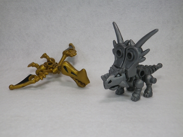 ほねほねザウルス(特別弾) 模型・玩具・食玩・フィギュア 2018年06月23日 『ほねほねザウルス×福井県立恐竜博物館(第2弾)』流遠亜沙 ASSAULT form「続けて『ほねほねザウルス』ネタよ。このシリーズにはオリジナルの“通常弾”と、コラボなんかによる“特別弾”の2つのラインがあって、これは特別弾に当たります」カナコ「判りやすい恐竜つながりね」 流遠亜沙 ASSAULT form「全4種類で、値段は少しお高めの380円(税抜)。骨格標本ながら関節が可動。ボーナスパーツをすべて集めるとティラノサウルスが完成」カナコ「スタンドに取り付け可能なマスコットキャラも愛らしいわ」『ほねほねザウルスEX』流遠亜沙 ASSAULT form「もう1つ。これが現時点でシリーズ最新作なんだけど、過去に発売された第16弾と第17弾の再録で、カラーバリエーションとなります」カナコ「厳密に言うと、4月に『カプセルほねほねザウルス』が出てるけど」流遠亜沙 ASSAULT form「ガシャポンなのよね。そこまで惹かれる内容じゃなかったから、それはスルーで」 カナコ「金と銀、意外と合うわね」流遠亜沙 ASSAULT form「そうなのよ。並べると豪華な感じがするし。なお、これは1箱400円(税抜)で2個入り。ボーナスパーツを集めると――」 ほねほねケルベロス ほねほねワイバーンカナコ「パッケージの『ほねほねケルベロス』と『ほねほねワイバーン』になるのね」流遠亜沙 ASSAULT form「なかなかカッコイイ。クリアパーツも綺麗で、光が当たるとこんな感じに――」カナコ「綺麗ね」流遠亜沙 ASSAULT form「窓際に飾ってたら偶然ね」カナコ「けど、これって今年の1月に出たのよね。もう6月なんだけど」流遠亜沙 ASSAULT form「カナコお姉さん、どうしてこのタイミングで『ほねほねザウルス』を記事にしたと思ってるの?」カナコ「そのノリ、今になって再開するの? それより、という事は……」流遠亜沙 ASSAULT form「うい。6月に第32弾の発売が発表されました。あと、畳みかけるように『ほねほねザウルス✕福井恐竜博物館SP』も6月発売予定です。こちらは再録のカラバリですが」カナコ「第32弾の方は、なんだかすさまじいわね」流遠亜沙 ASSAULT form「新たな試みで、とても興味深い。これは買わねば」『ほねほねザウルス』スペシャルサイトはこちら PR