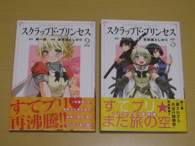 すてプリ☆まだ旅の空 榊一郎作品関連 2018年11月26日 『スクラップド・プリンセス』第2~3巻原作:榊 一郎漫画:曽我部 としのり遅ればせながら第2巻と第3巻、読了。今になってのコミカライズに驚いた『すてプリ』だが、残念ながら全3巻で最終巻。アニメではまるっと削られた、故郷を出るまでのエピソードを原作に忠実に描いているので、懐かしさと新鮮さを感じつつも、このペースだと原作の最後までは無理だと思ってはいた。結果、タウルスの街でウイニアと出会い、〈中継点〉を倒して街を出るまでで完。だが、これが思いのほか良かった。読む前は「これで終わりなのか……」とネガティブな気持ちだったのだが、非常に内容が良いため、これで終わりでも惜しくないというか、だからこそもっと読みたかったというか……複雑。あと、個人的には故郷の村の領主のメイドさんがクールビューティで素敵。当時はまだメイドさんってメジャーじゃないため、榊一郎と言えばメイド好きという印象すらあった。そしてコミカライズ版のウイニアの可愛らしいこと。原作やアニメだと影がある、ちょっと毒舌なのだが、純朴な村娘になっていて、これはこれで全然アリ。アニメ版もすごく良かったが、今回のコミカライズ版もとても良い。『すてプリ』未読の人に興味を持ってもらう、「こういう作品」と説明するにはうってつけだと思う。これを読んで気になったら、原作かアニメで続きを是非。大好きで、創作活動にも多大な影響を受けてる作品なので。試し読みが出来るコミッククリアのページはこちら PR